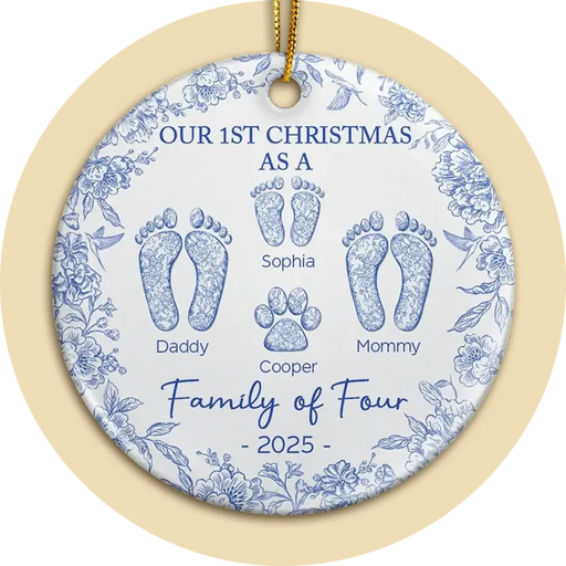 Christmas, Family, Dog Lovers, Cat Lovers, Pet Lovers, Parents, Happy - First Christmas As A Family Of Four Toile Footprints - Personalized Circle Ceramic Ornament