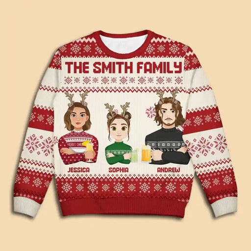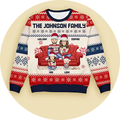 Cartoon Couple With Kids And Pets - Personalized Unisex Ugly Sweater
