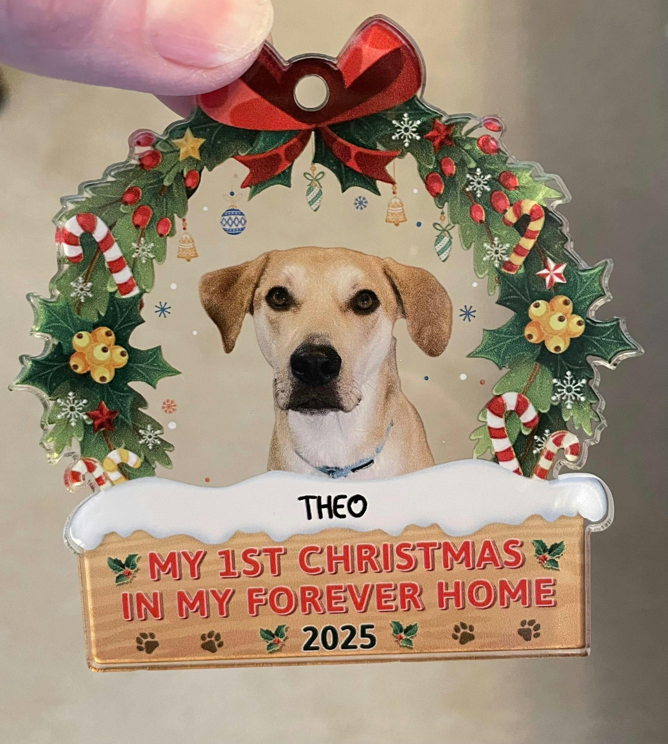 Create lasting memories with a unique ornament that features a custom photo of your beloved pet, making it a truly meaningful and delightful addition to your holiday decor. This ornament captures the special moment of a pet's first Christmas in their forever home, adding a personal touch that is both appreciated and unforgettable.
