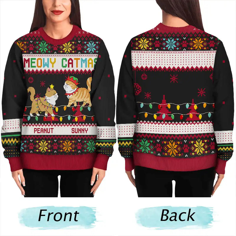 Christmas Funny Walking Cats Meowy Catmas Happy Pawlidays - Personalized Unisex Ugly Sweater