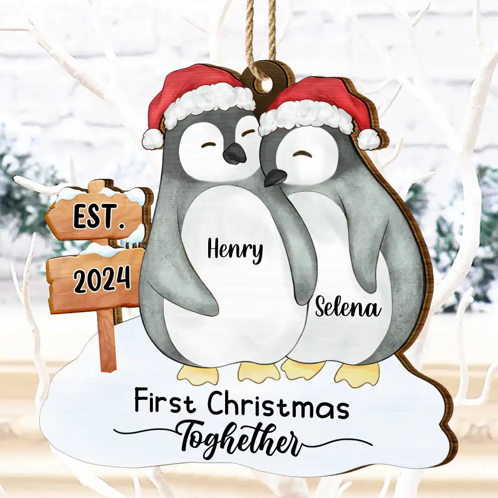 First Christmas Married Penguin Couple - Personalized Custom Shaped Wooden Ornament