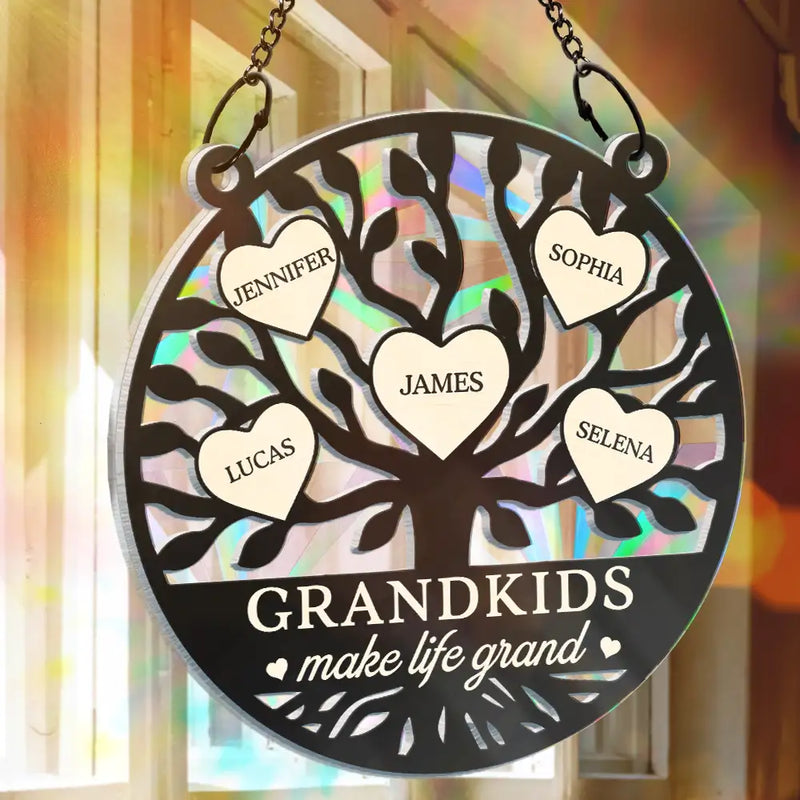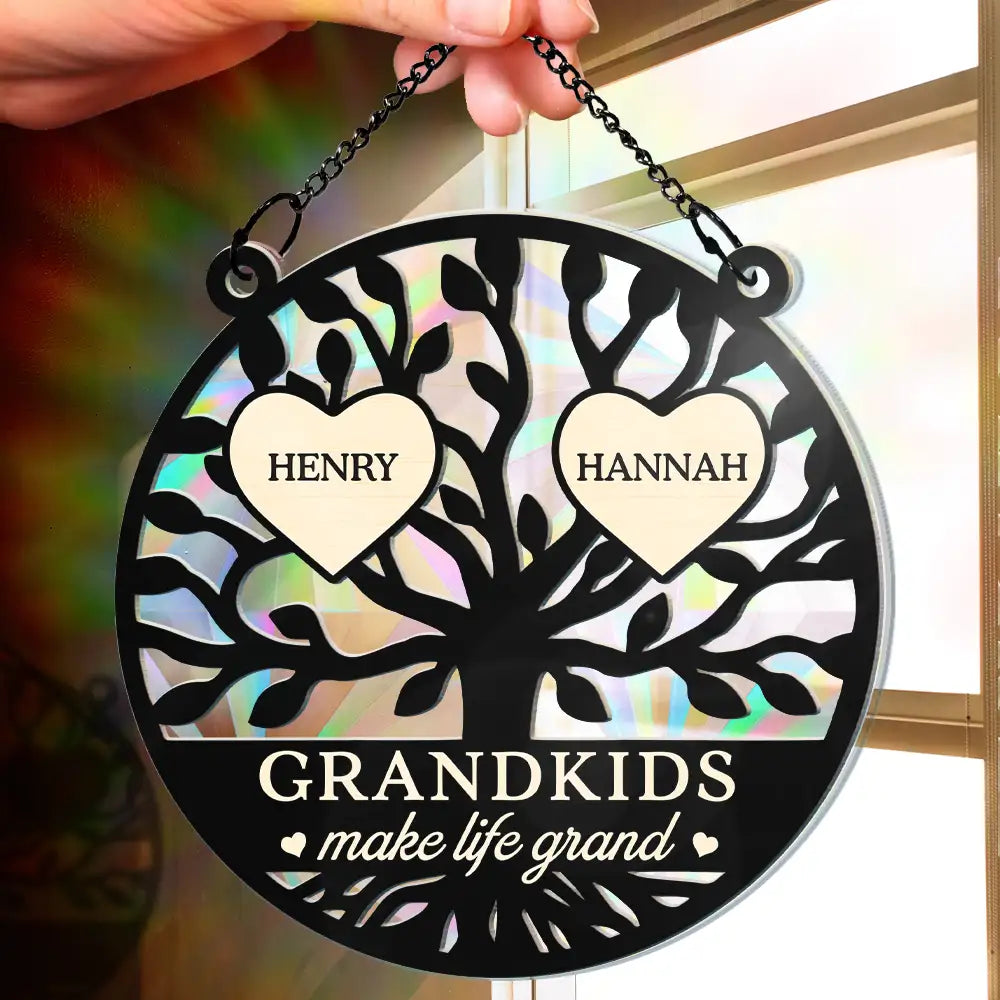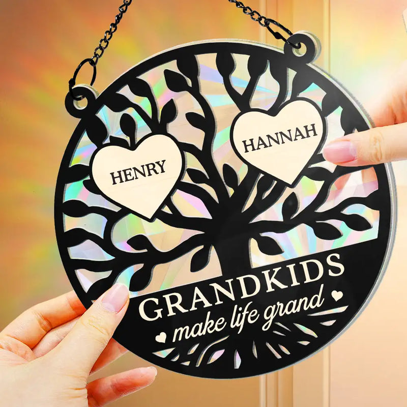 Tree Of Heart Grandkids Make Life Grand - Personalized Window Hanging Rainbow Suncatcher