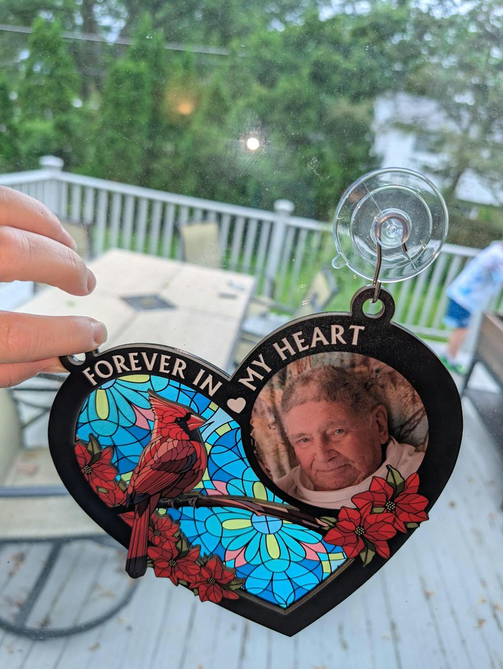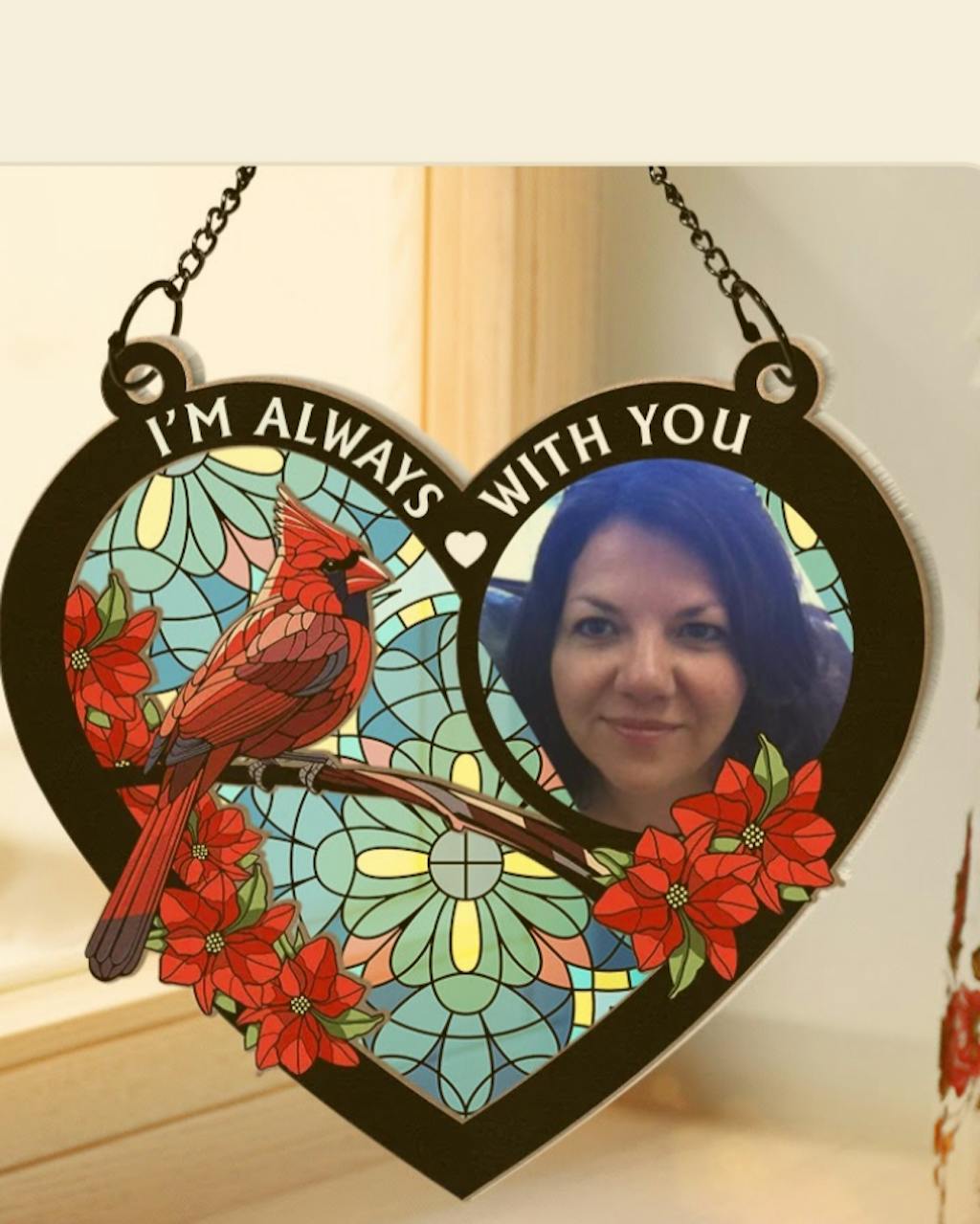 Honor the memory of a cherished loved one with the " Custom Photo I'm Always With You Memorial Heart" personalized window hanging suncatcher ornament. This heartfelt tribute is more than just a decoration; it's a comforting reminder that their presence will forever be felt. Perfect gift for Father's Day, Thanksgiving, Christmas, birthday, or anniversaries.