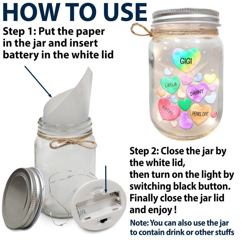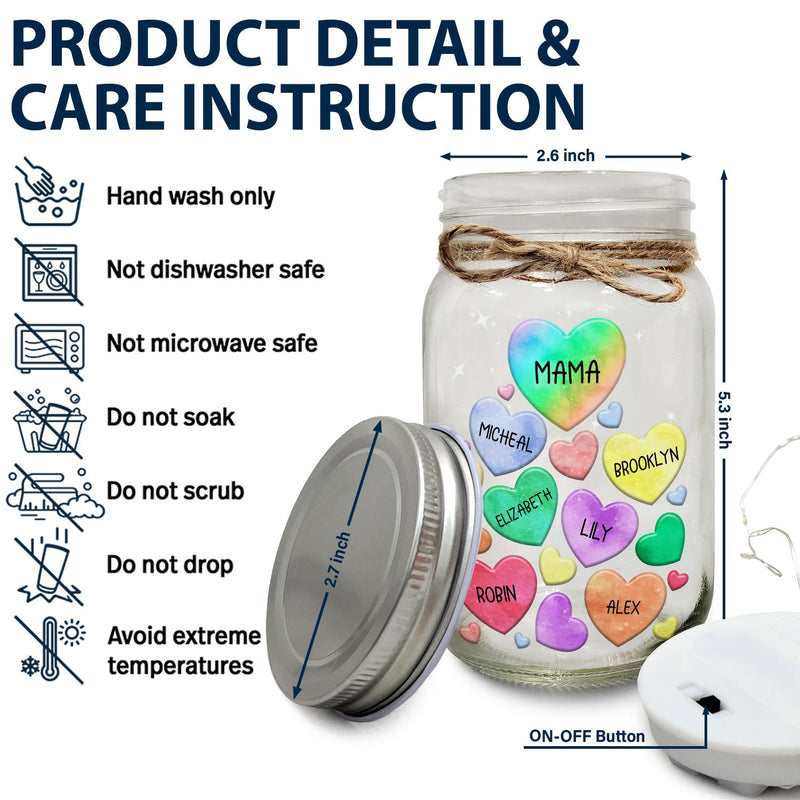 Grandma's Sweethearts Heart By Heart - Gift For Nana, Mom, Mama - Personalized Mason Jar Light