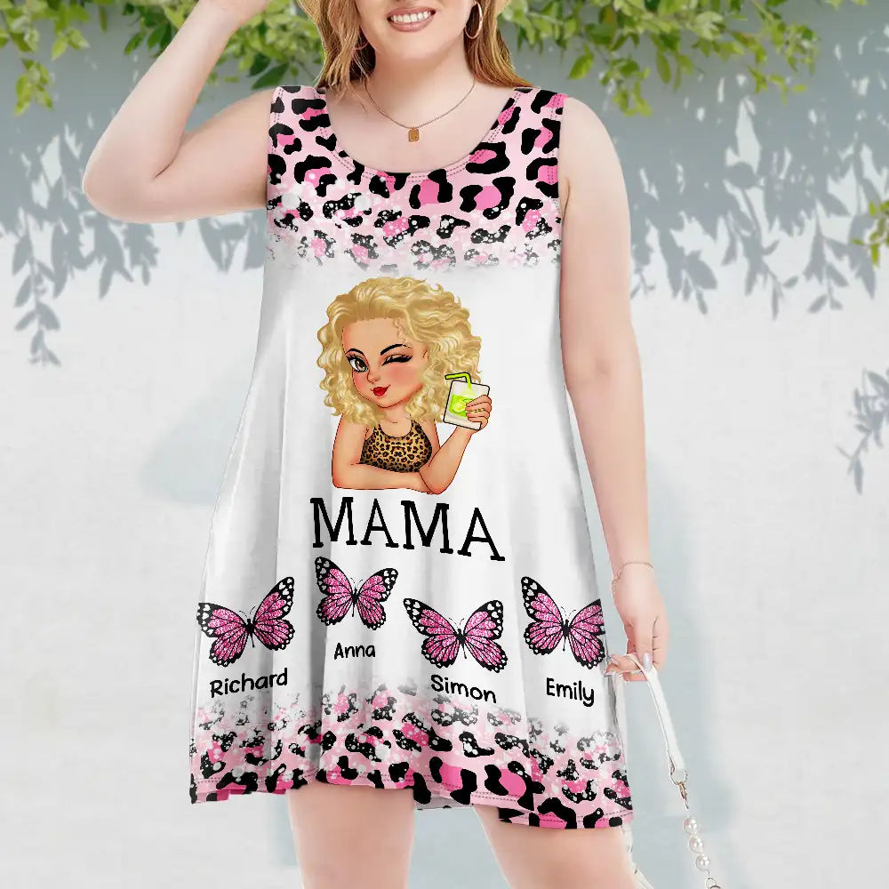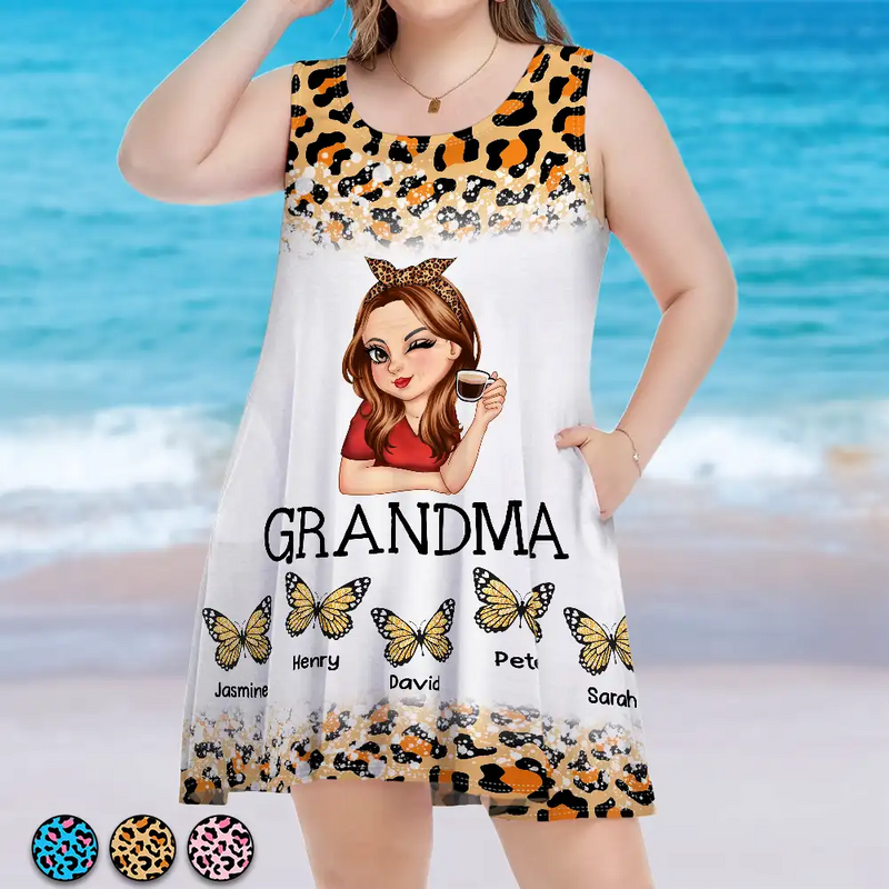 Mom Grandma Kids Butterflies Leopard Pattern - Personalized Sleeveless Tank Dress