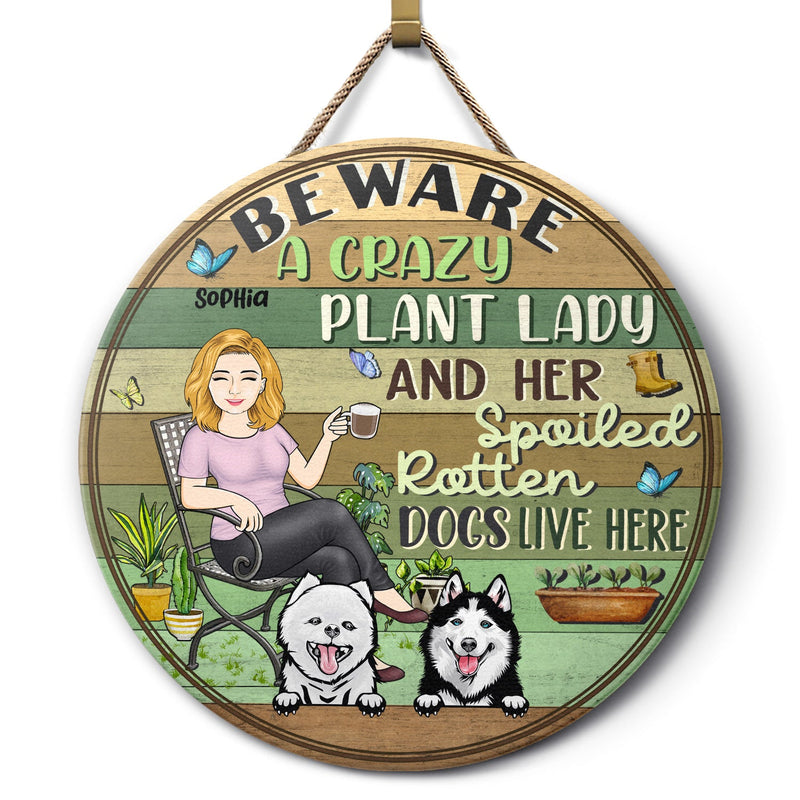 Beware A Crazy Plant Lady & Her Spoiled Rotten Dogs Live Here Gardening - Garden Sign, Birthday, Housewarming Gift For Her, Him, Gardener, Outdoor Decor - Personalized Custom Wood Circle Sign