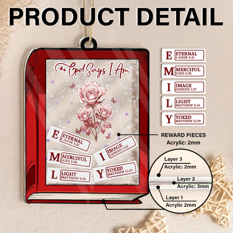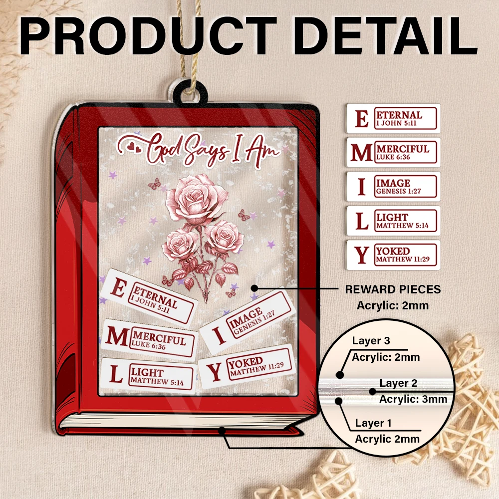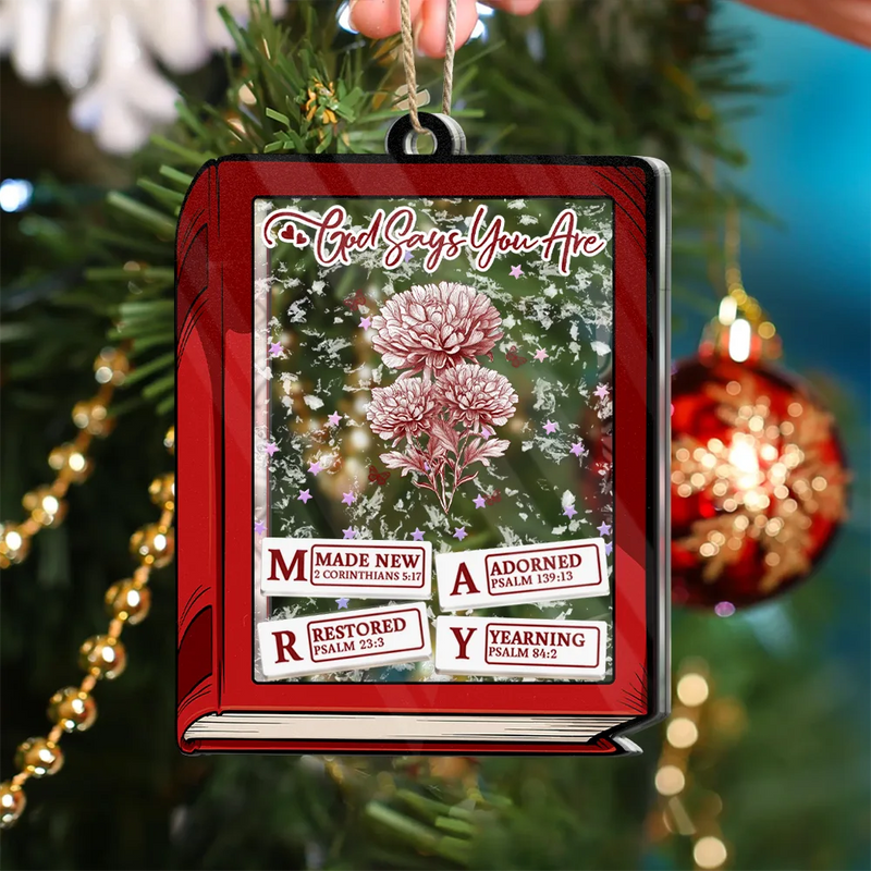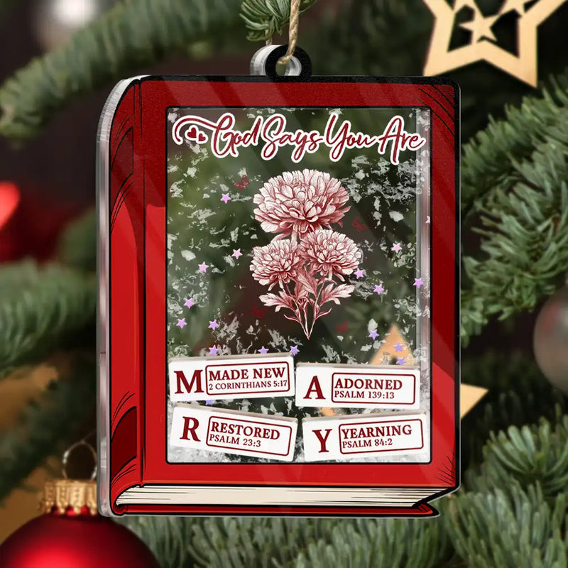God Says I Am Toile De Jouy Birth Flower Book Shape - Personalized 3-Layered Acrylic Shaker Ornament