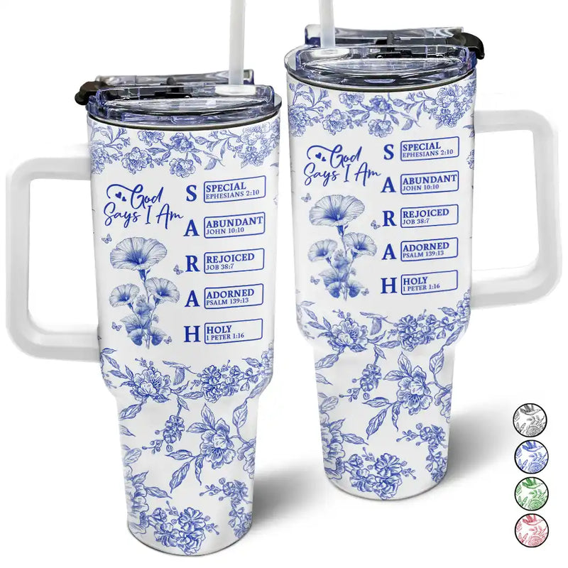 God Says I Am Toile De Jouy Flower - Personalized 40oz Tumbler With Straw