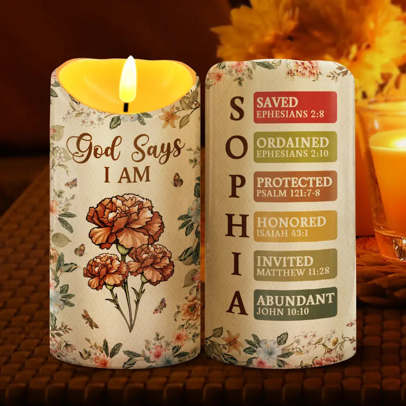 Discover peace and beauty with the Stained Glass Birth Flower Mosaic Art God Says I Am - Personalized Flameless LED Candle, a meaningful piece that makes the perfect gift for women, yourself, or Christian friends. Ideal for Christmas, Thanksgiving, birthdays, Mother’s Day, Father’s Day, or church events, this candle brings light and comfort to every space.