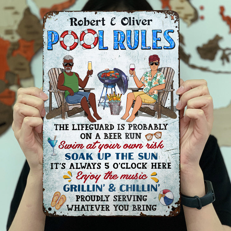 Pool Rules Swim At Your Own Risk Grilling Couple Husband Wife Pride - Backyard Sign - Personalized Custom Classic Metal Signs