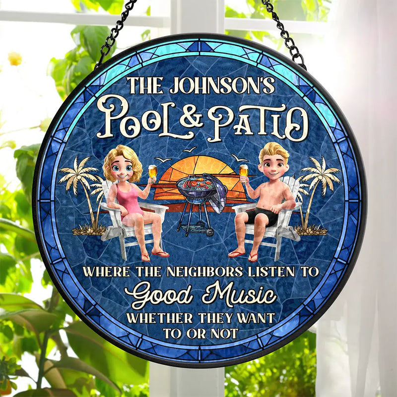 Couple Pool & Patio Sipping Chilling - Personalized Stained Glass Window Hanging Suncatcher