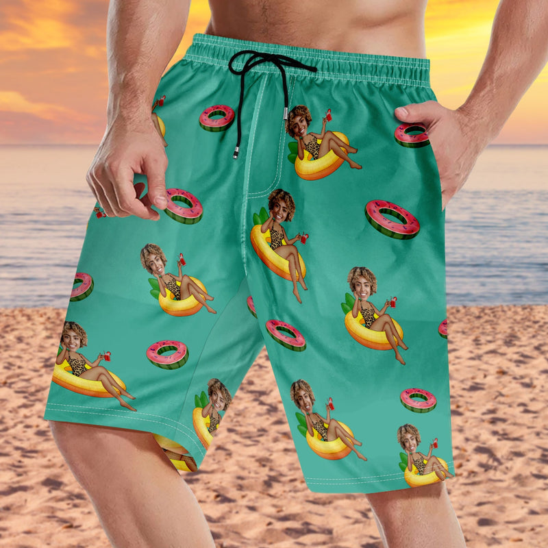 Custom Photo Funny Girlfriend Wife On Flamingo - Gift For Boyfriend, Husband - Personalized Unisex Beach Shorts