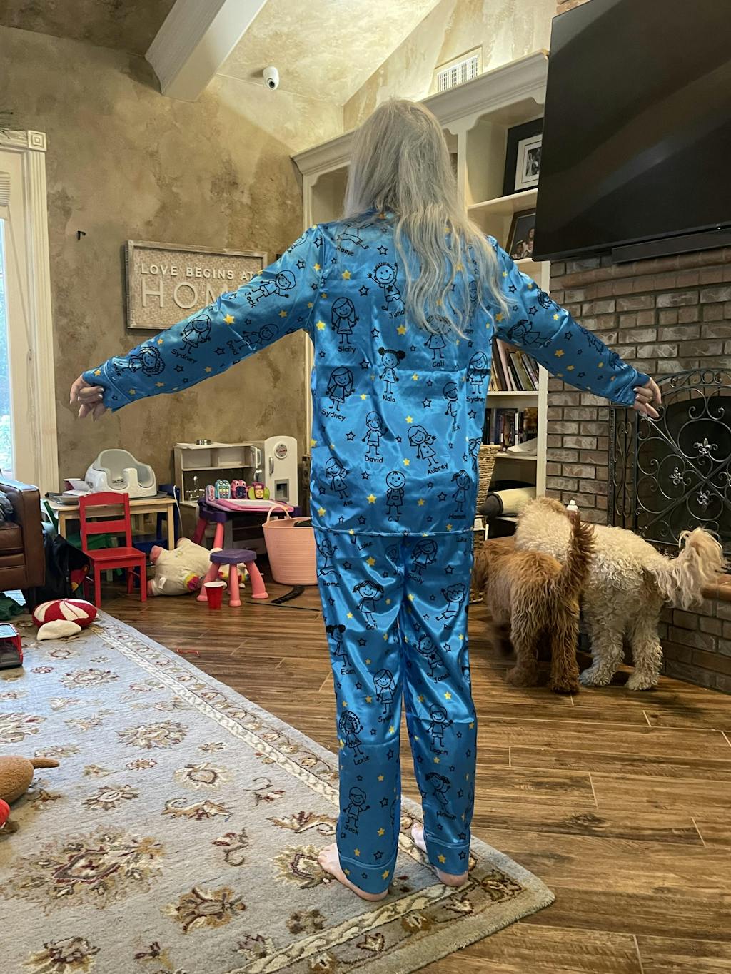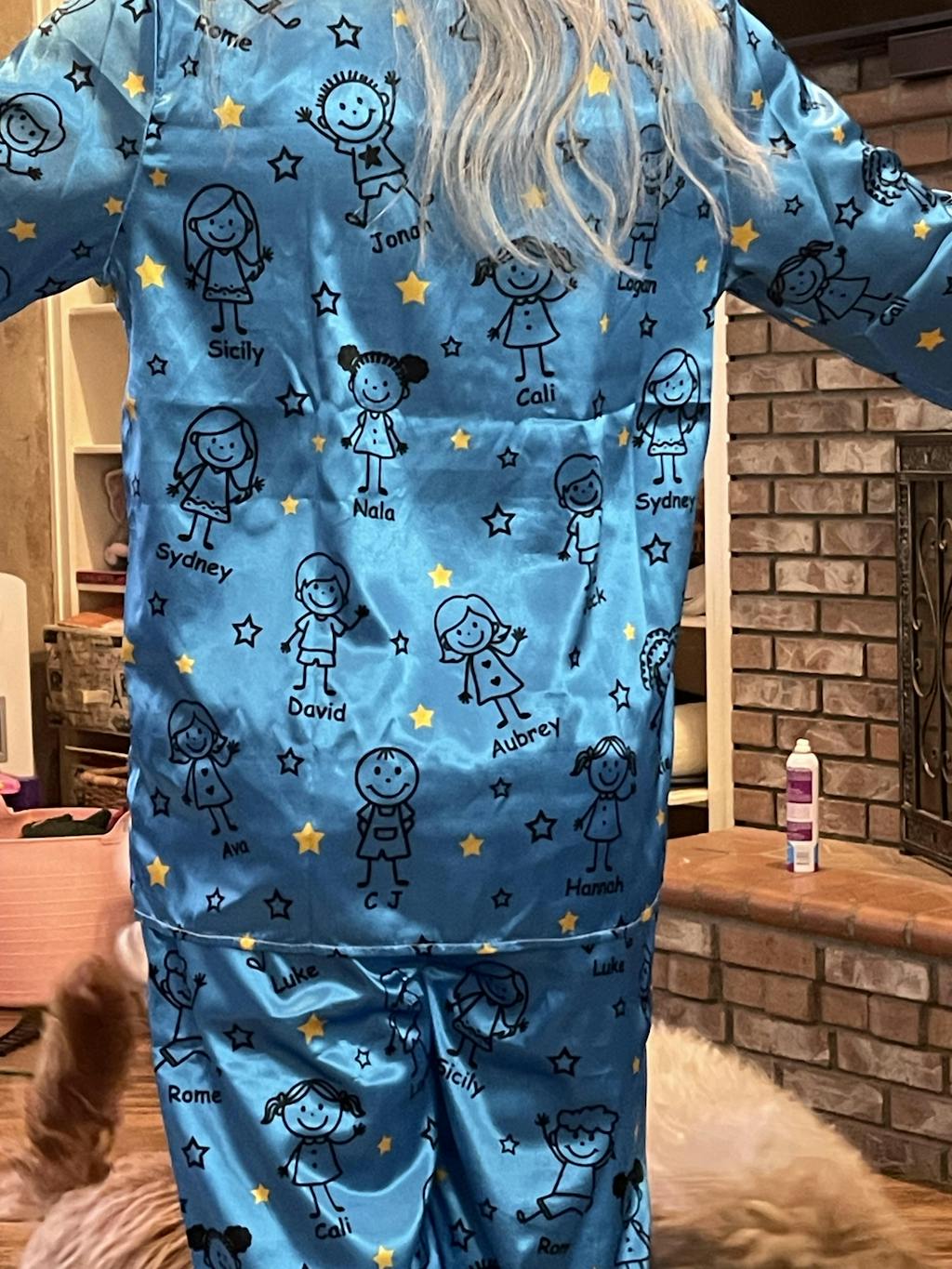 Crafted from smooth satin that feels soft against the skin, this custom pajama set can be personalized with names of kids, grandkids, or pets, making every detail feel heartfelt and unique. Whether lounging on cozy mornings or enjoying movie nights, this set brings happiness and family love to every moment.